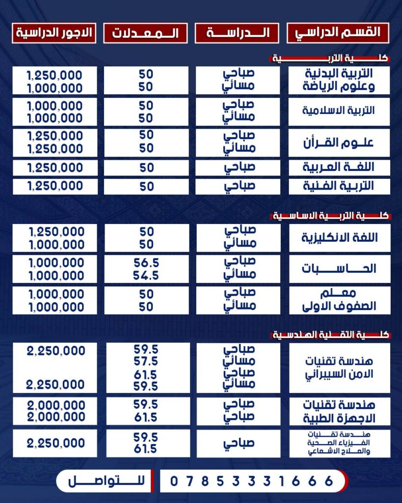 الدراسة الصباحية | 2.750.000 مليون دينار عراقي الدراسة المسائية | 2.250.000 مليون دينار عراقي